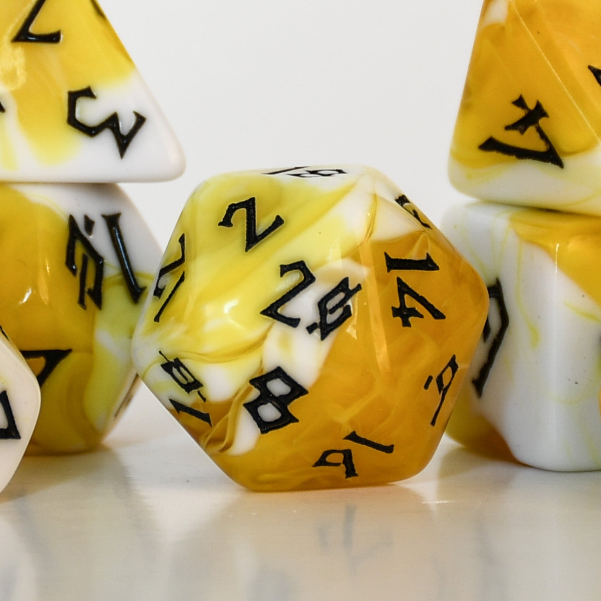 Our acrylic dice are carefully poured into individual molds and cured inside a vacuum chamber to ensure no air bubbles are trapped inside the dice. After curing, each individual die is removed from the mold and the numbers are painted by hand. These dice are perfect for any RPG and will be sure to impress at your upcoming session!