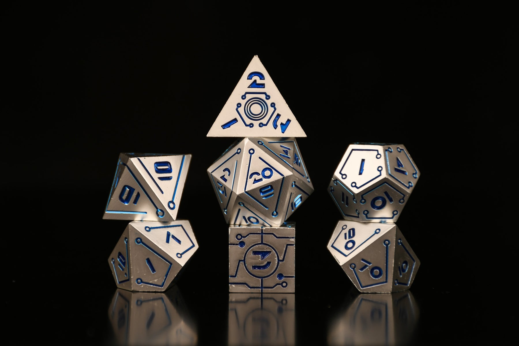 Jack in. Roll out. The Cyberlink Infosec Silver Blue Dice Set is built for players who live in the neon future — die-cast zinc alloy in polished silver and rich blue, as sharp and precise as a well-executed hack.