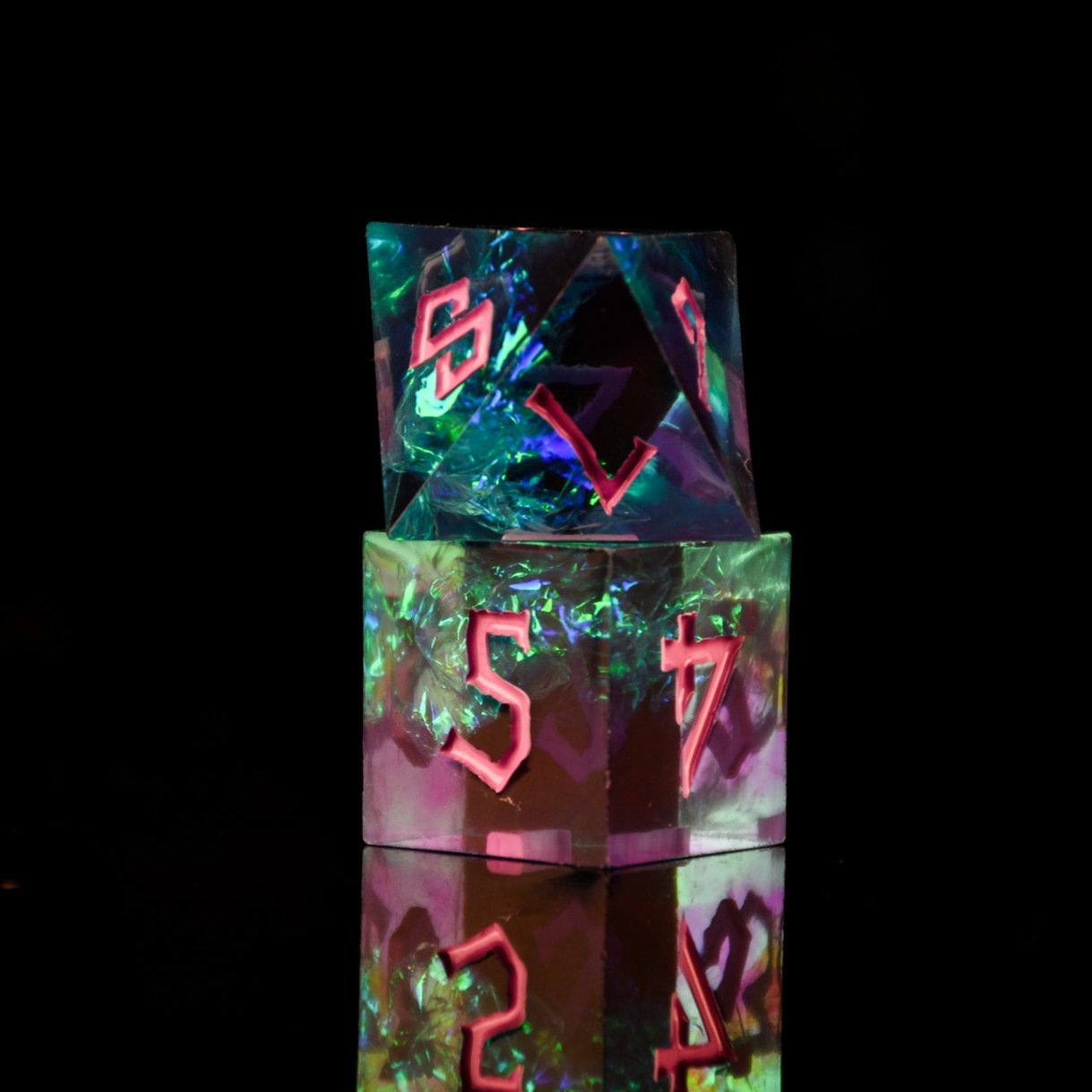 Sharp edges. Vivid color. Pure performance. The Dispel Magic Sharp-Edged Resin Dice Set features mathematically flat sharp-edged faces for cleaner rolls and easier reading, with hand-painted numerals and striking coloring that runs deep through every die. Featuring striking coloring deep through the resin.