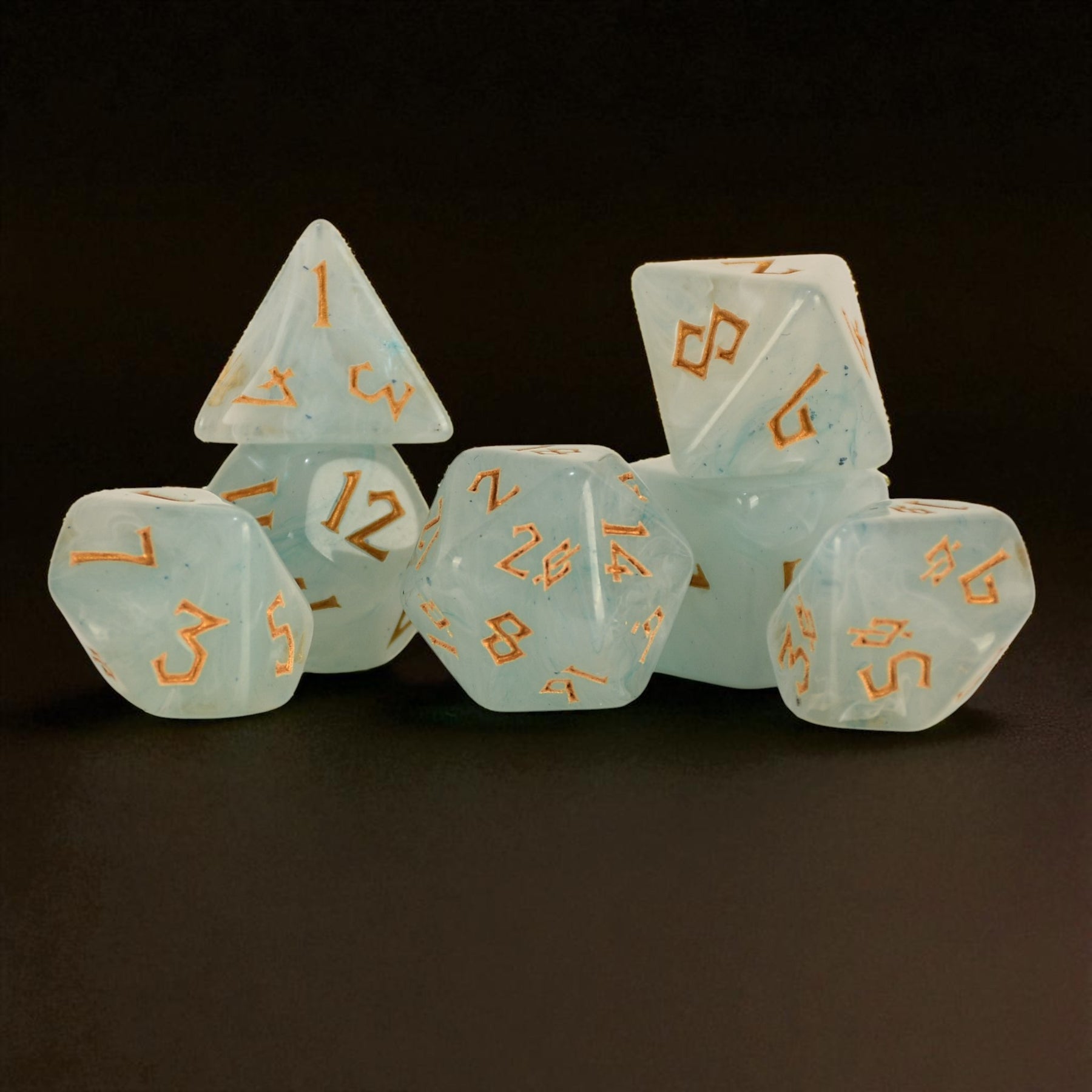 Includes: 7-piece acrylic set (D4, D6, D8, D10 (00–90), D10 (0–9), D12, D20) | Material: Acrylic | Theme: Elixir of Divination | Lifetime warranty on all dice + 30-day money-back guarantee.