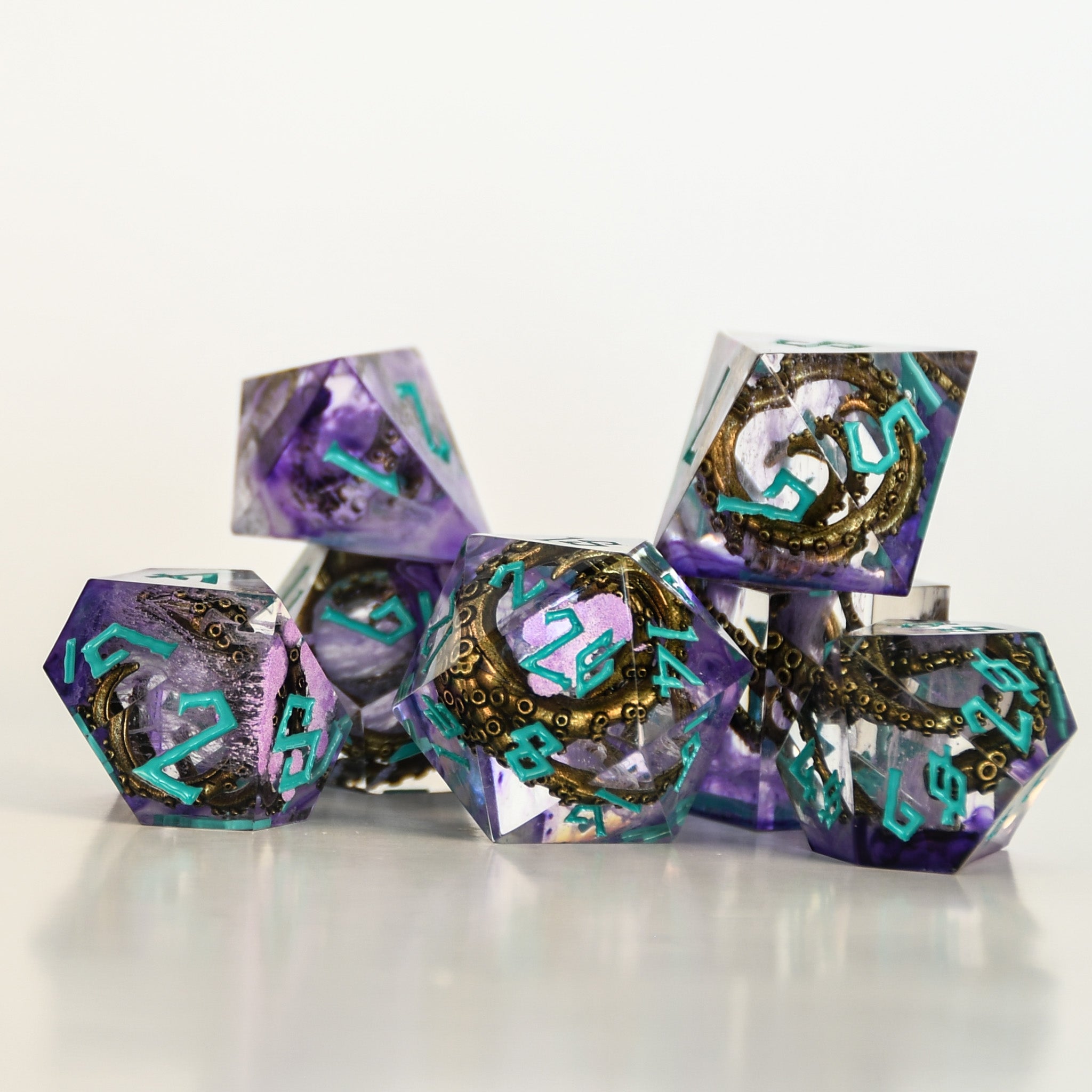 Hand-crafted from beginning to end, our sharp-edged resin dice feature gorgeously hand-painted numbers. These dice are ideal for any tabletop RPG game and are sure to impress at your upcoming session!