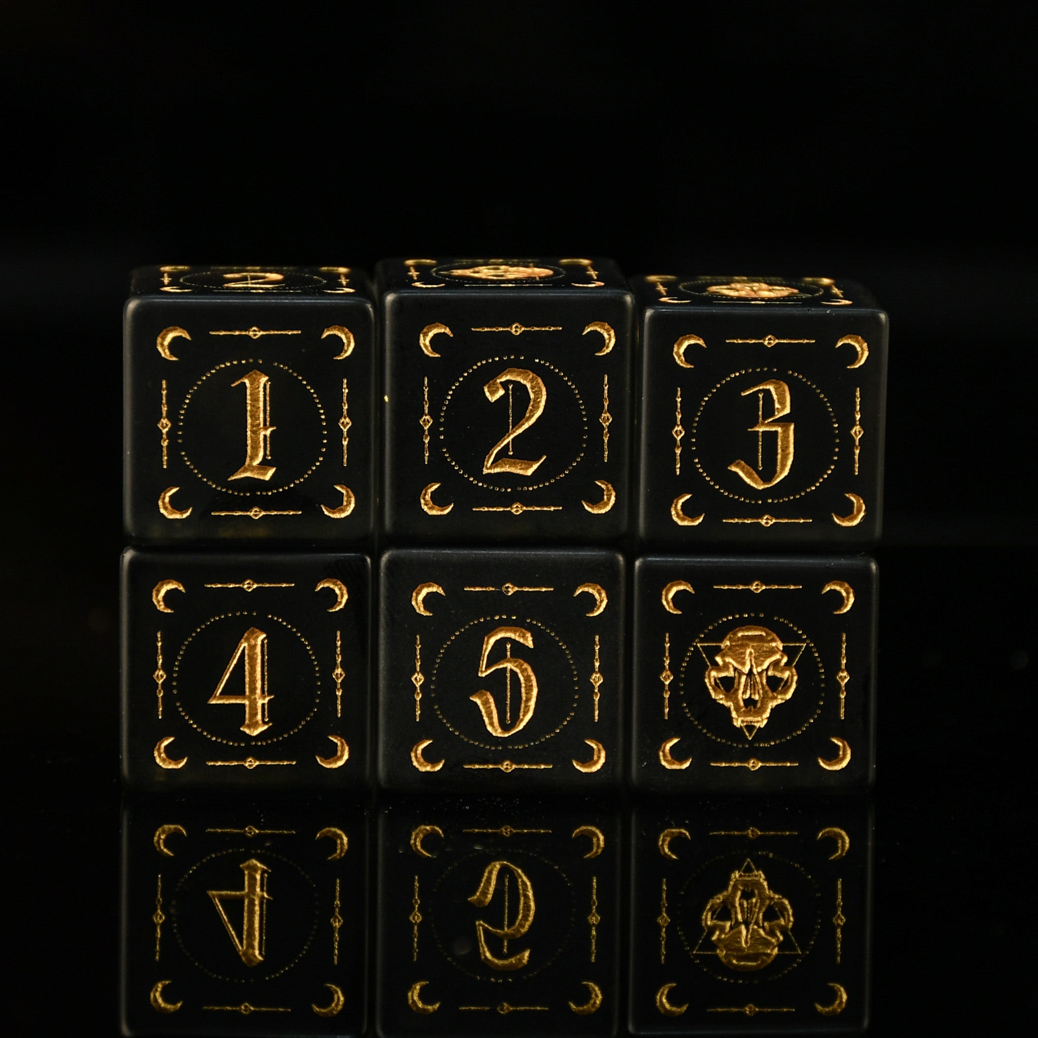 Each die is hand-carved from glass and sand-blasted. Designs are then engraved into each side and hand-painted. Glass dice are never guaranteed to have a perfectly balanced weight; however, each of our dice sets is always well-weighted and well-balanced.