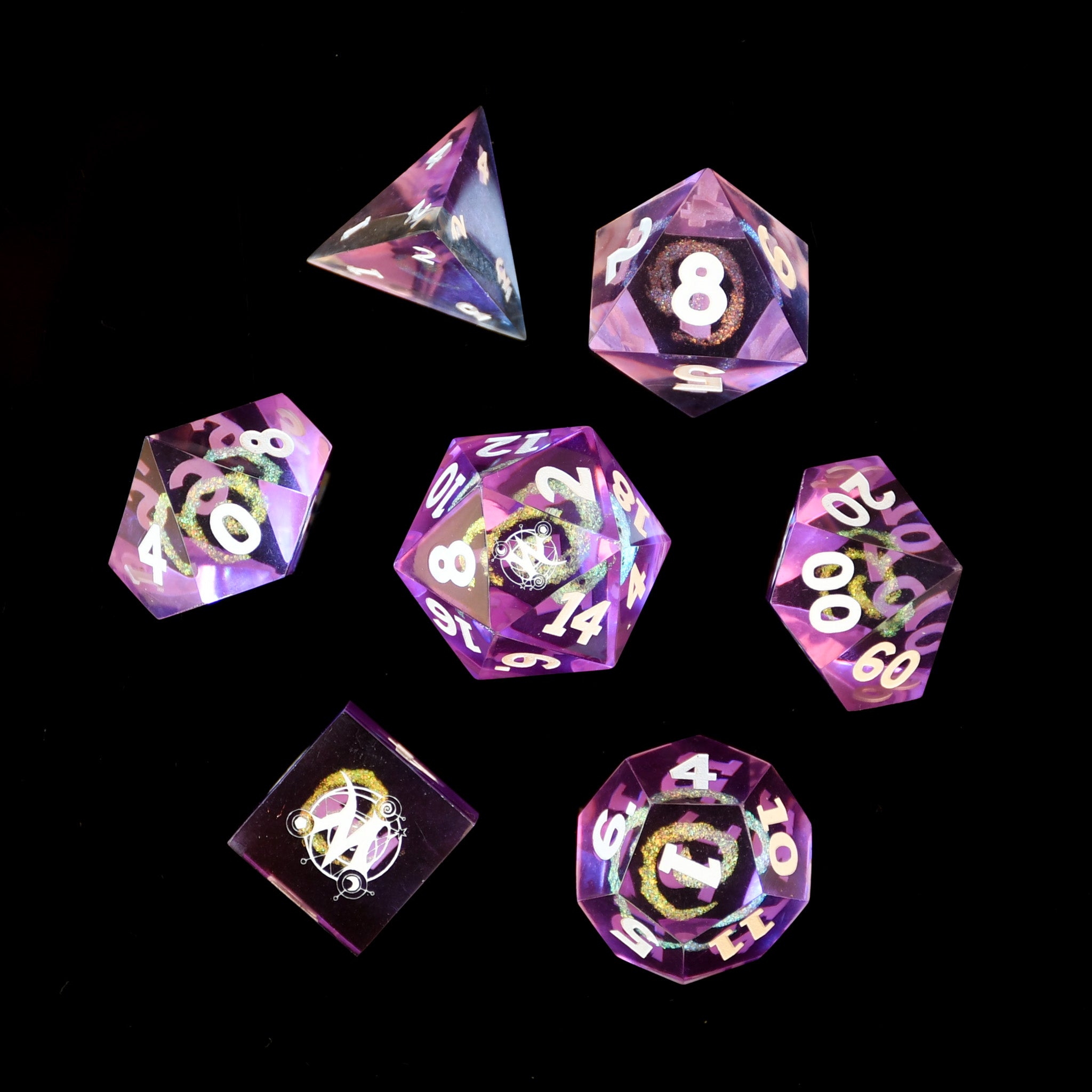 Experience the Spiral in a whole new way with the Official Wizard101 x Misty Mountain Gaming Sharp Edge Resin Dice Set! Handcrafted from high-quality resin, each die showcases a stunning embedded Wizard101 Spiral symbol, floating elegantly at the heart of the design.