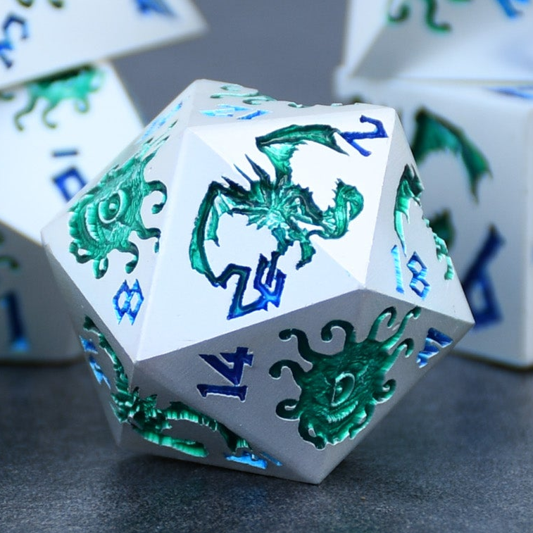 Our metal dice sets are all cast from zinc alloy metal to ensure better-balanced rolls. This set is perfect for any RPG and will be sure to impress at your upcoming session! Every set comes with its own metal dice tin for easy storage and a winning presentation.