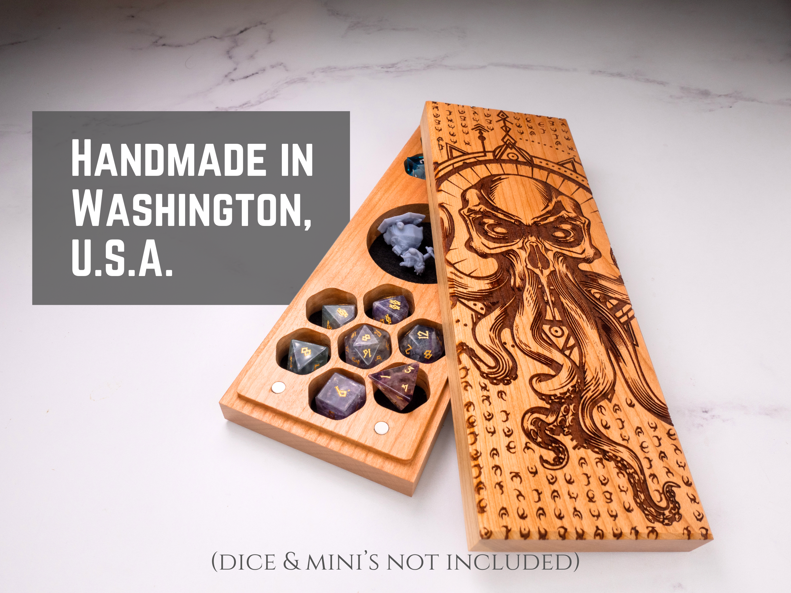 Measures 10" long, 1.5" tall, and 3.75" wide, holding two sets of 7 polyhedral dice (dice not included) plus 2–3 minifigures