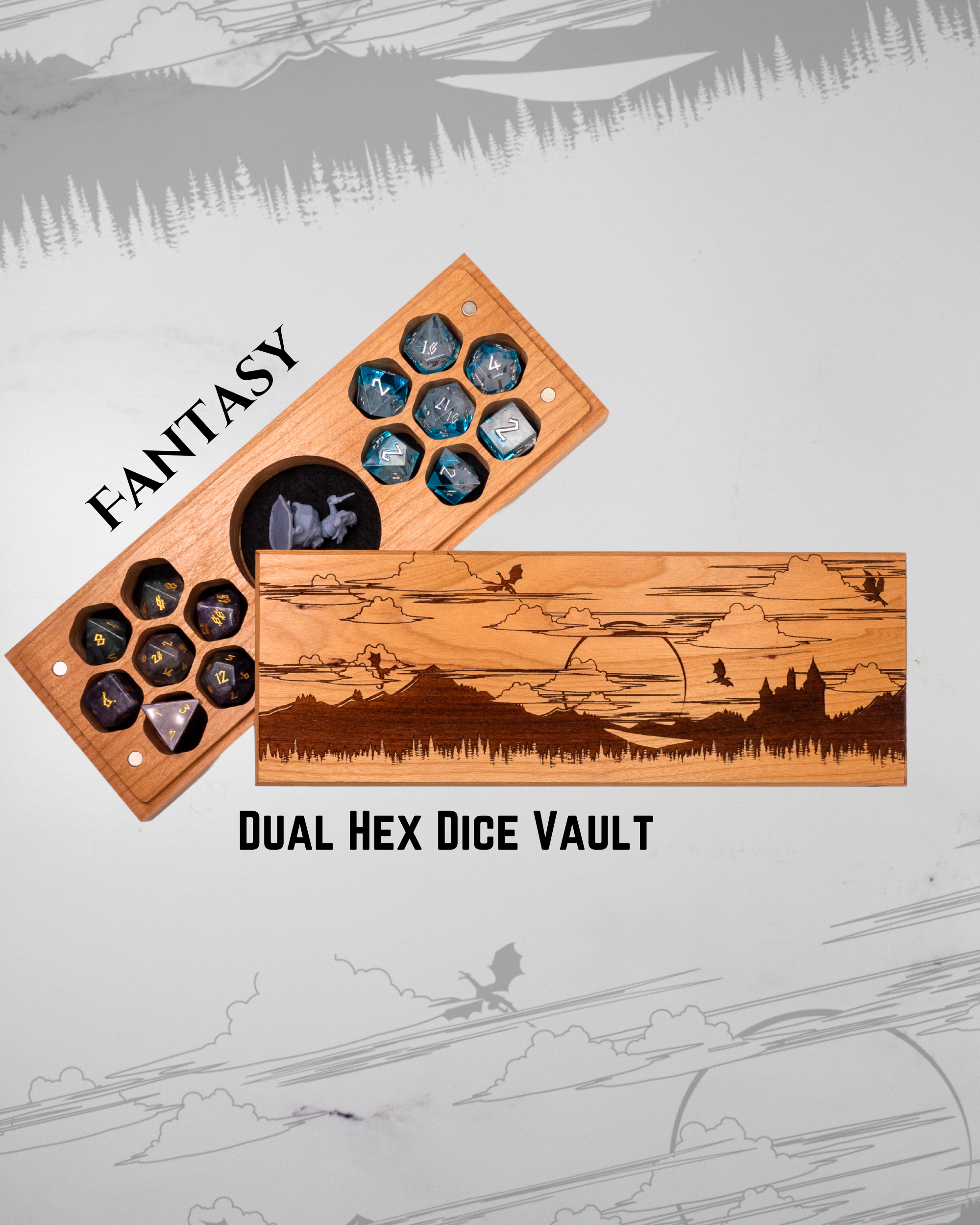 Step into a realm of epic storytelling with Fantasy, a sweeping forest and mountain landscape set under a glowing full moon, where multiple dragons roam the starry sky. This immersive design adds a touch of wonder to your gaming setup, while the vault itself provides reliable protection for all your dice-fueled quests.