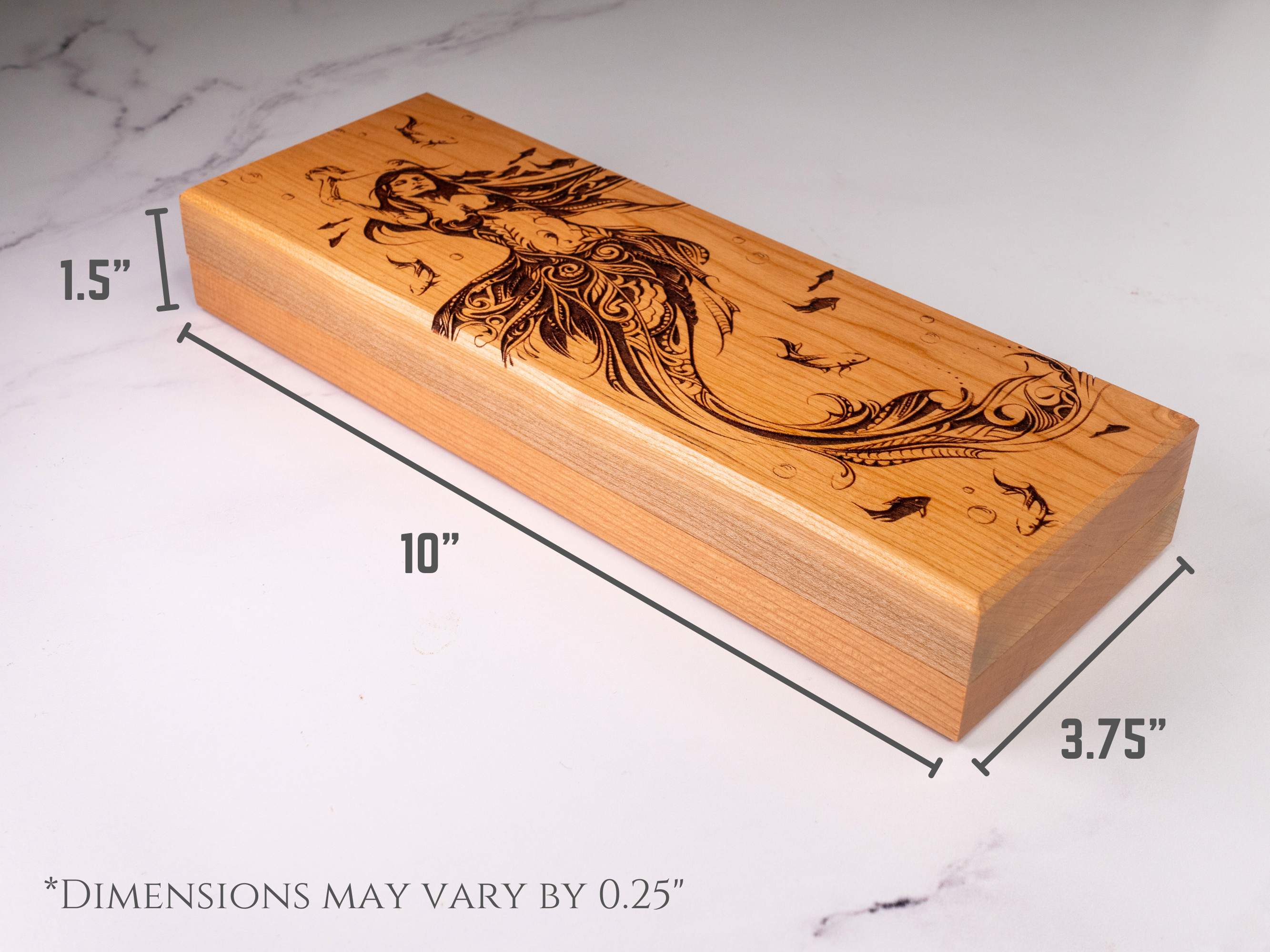 Dive into an enchanting realm with Mermaid, a captivating design featuring a beautiful siren surrounded by playful fish. Equal parts alluring and dangerous, this dice vault infuses your games with undersea intrigue, ensuring your dice remain safeguarded from the ever-shifting tides of adventure.