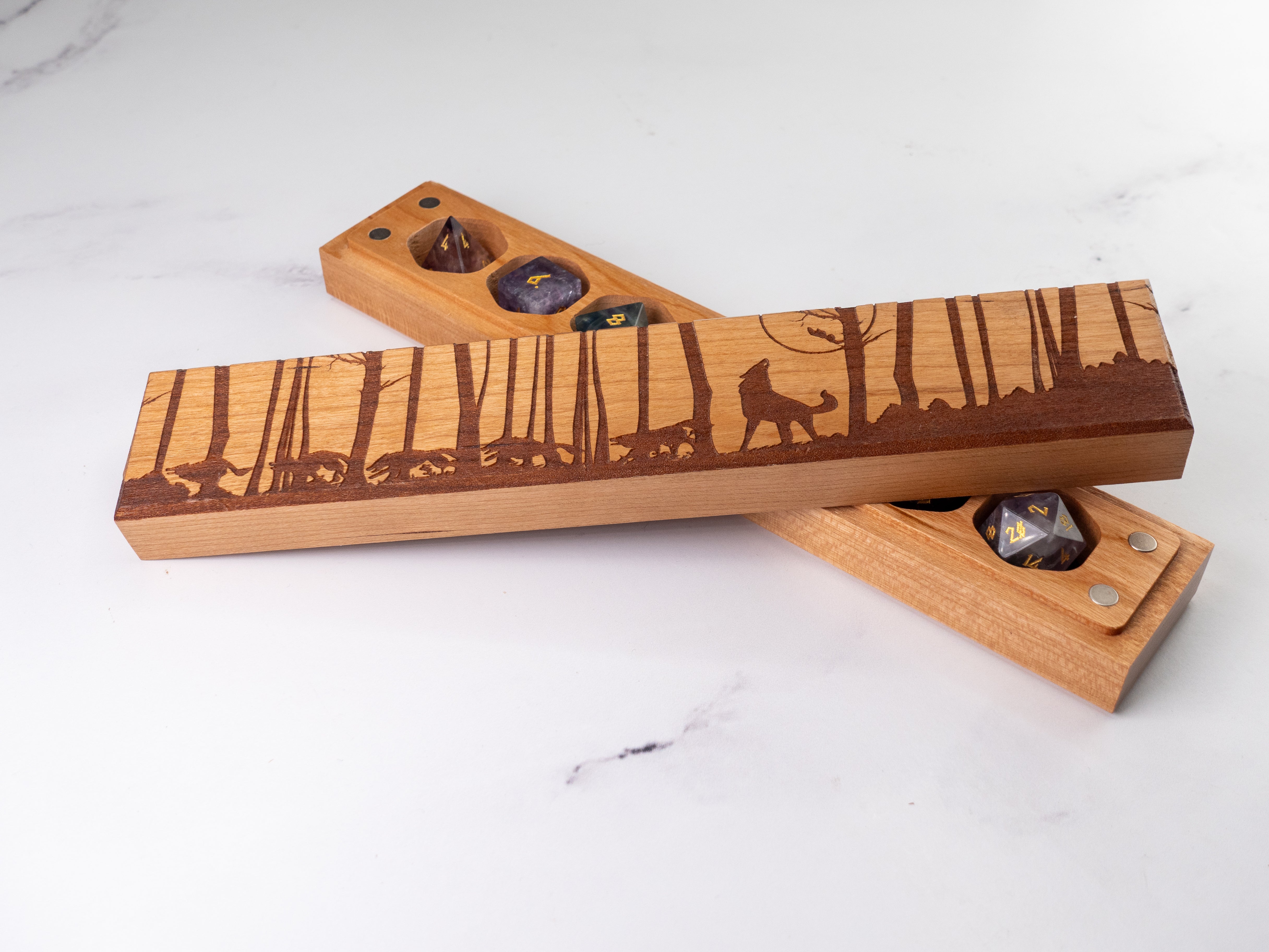 Howl at the moon with Wolfpack, a dynamic silhouette of wolves racing through a forest and baying beneath a bright lunar glow. Crafted for adventurers who relish the call of the wild, this dice vault stands guard over your dice, ready for any midnight foray into the unknown