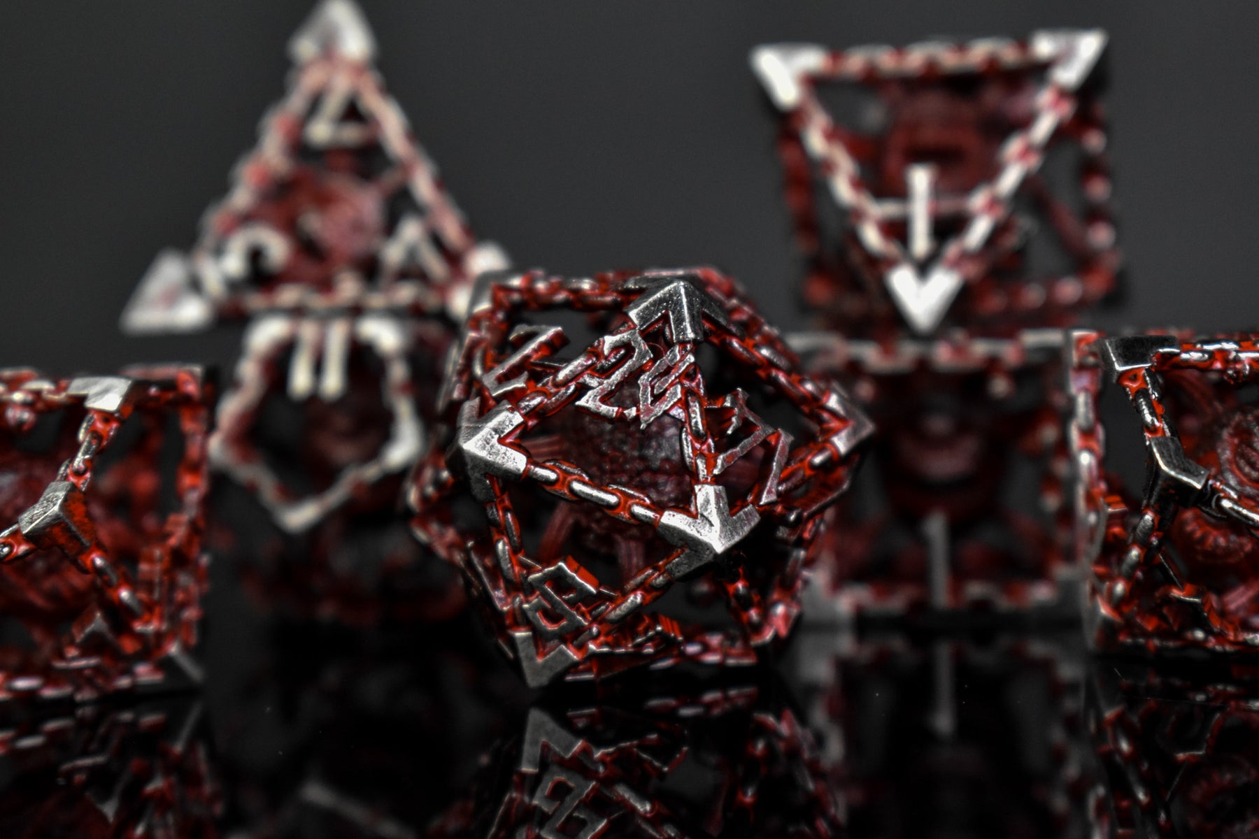 ビホルダーはすべてを見通す――あなたの卓上では、敵が震えているのが見えます。ビホルダーの門中空金属サイコロセット - ブラッディッドシルバーは、磨き上げられたシルバー仕上げのプレミアム中空金属サイコロセットです。ダイキャスト亜鉛合金製で、重厚感のある見た目と満足のいく重さがありながら、無垢の金属の全重量はなく、卓上での響き渡る音は皆の注目を集めます。