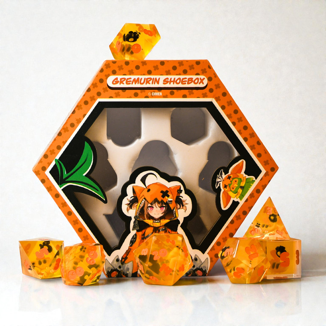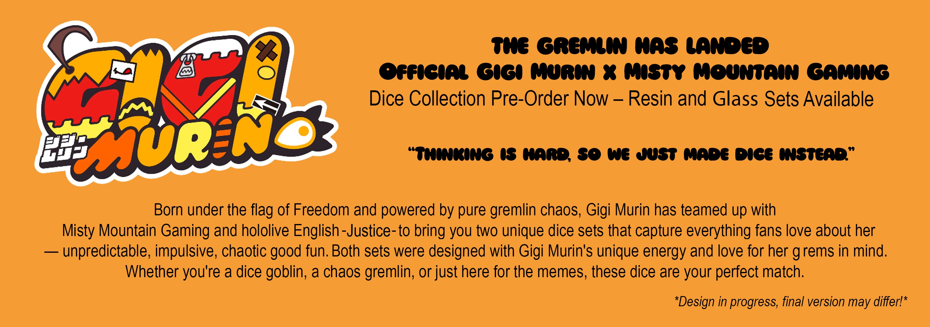 hololive English -Justice-とのコラボレーションにより製作されたこのセットは、ギギ・ムリンの予測不能で直感的な性質を捉えるようにデザインされており、戦略よりも衝動、正気よりもばかばかしさを選ぶあらゆるゲーマーに最適です。計画性ゼロで敵を追いかけようと、パーティーを笑わせるためだけにキャンペーンを脱線させようと、このダイスは最大の混乱のために作られました。