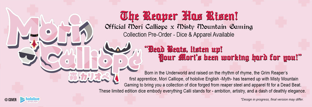 Misty Mountain Gaming and hololive English’s very own Mori Calliope have descended from the Underworld to craft a dice set worthy of the Reaper herself.