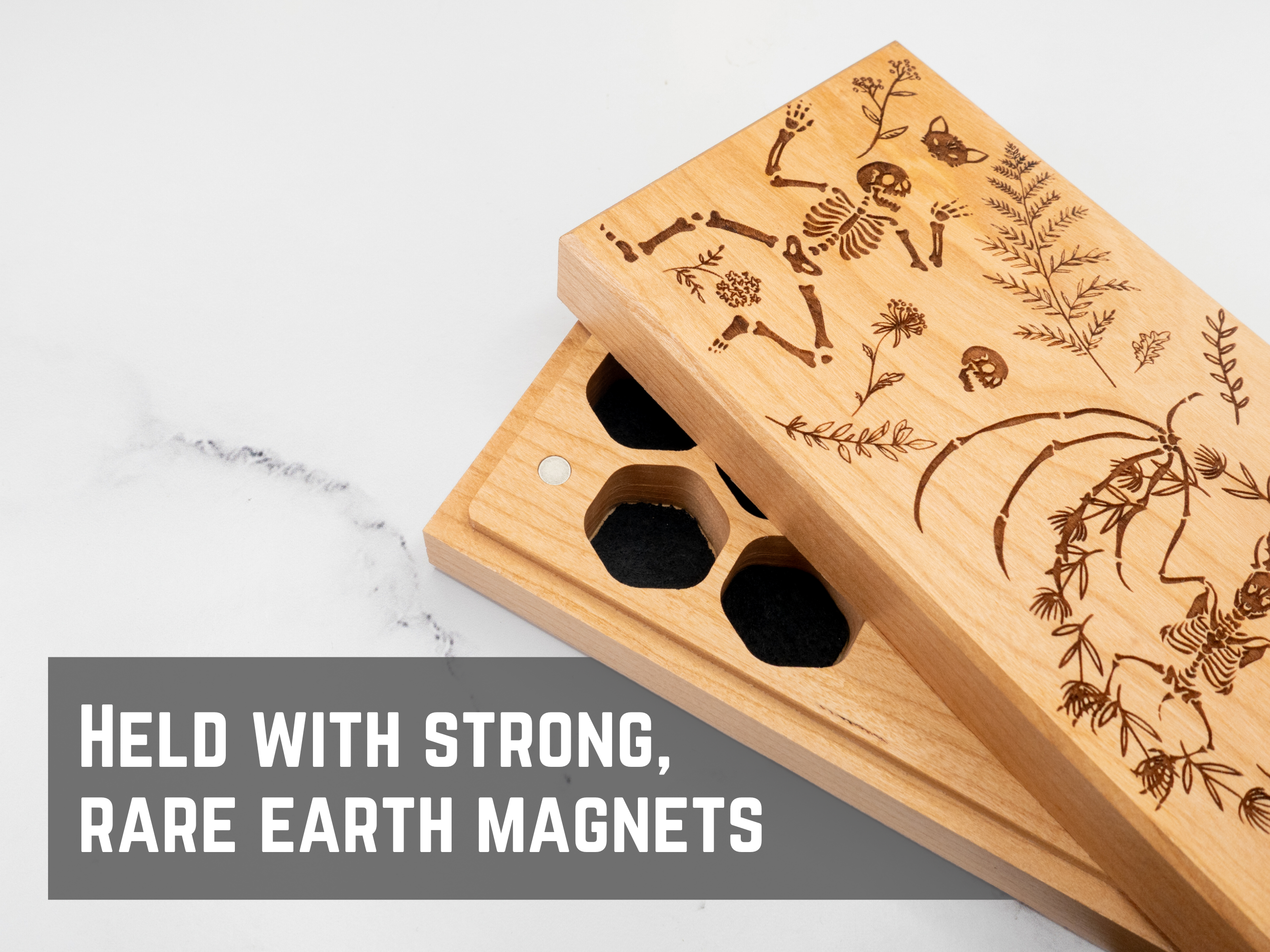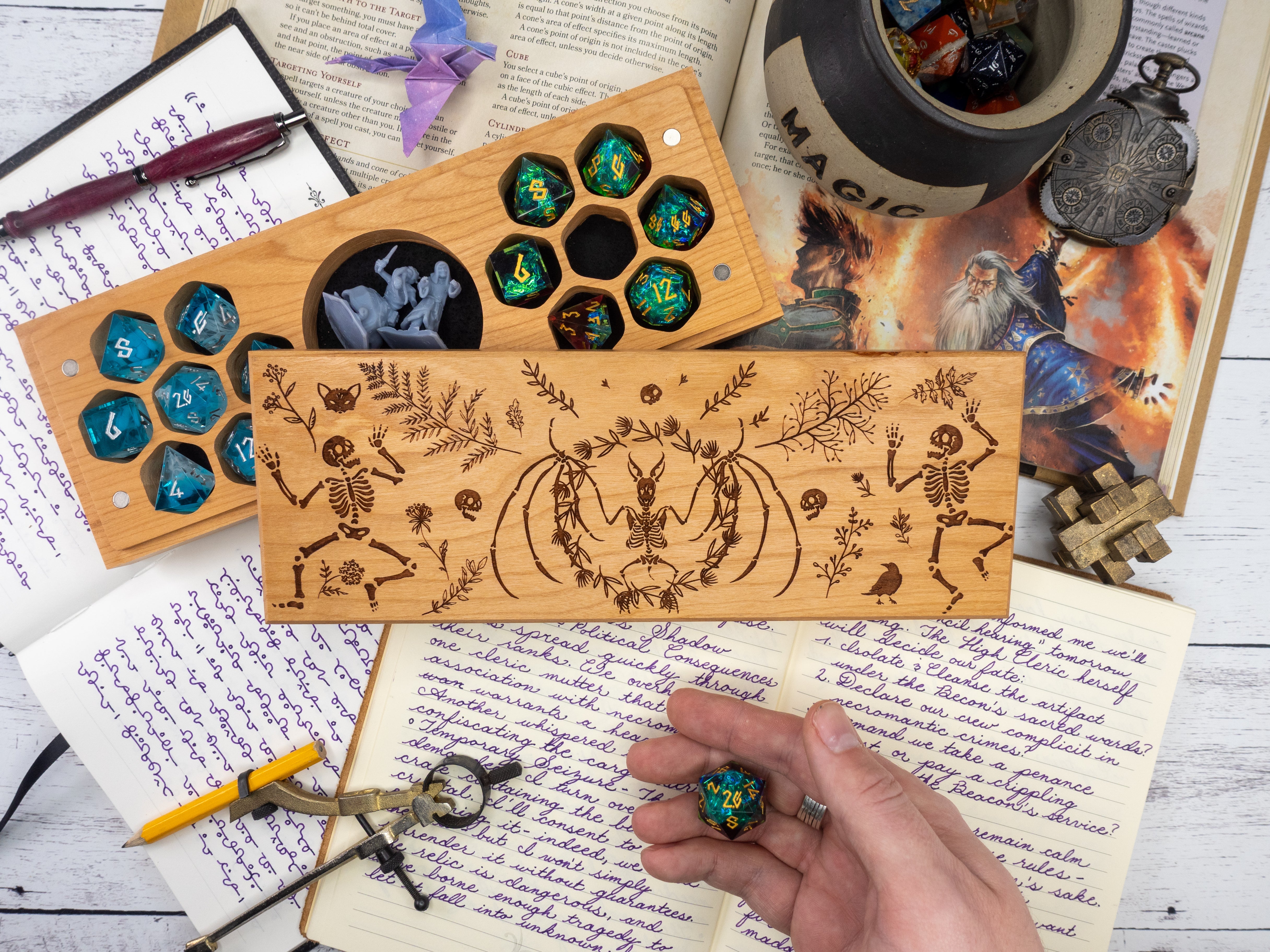 Liven up your table with Dancing Skeletons, a playful scene of jigging bones—including one with wings—that turns the macabre into pure fun. Robust and handcrafted, this dice vault adds a spirited flourish to your gaming setup, while keeping your dice safe and sound.
