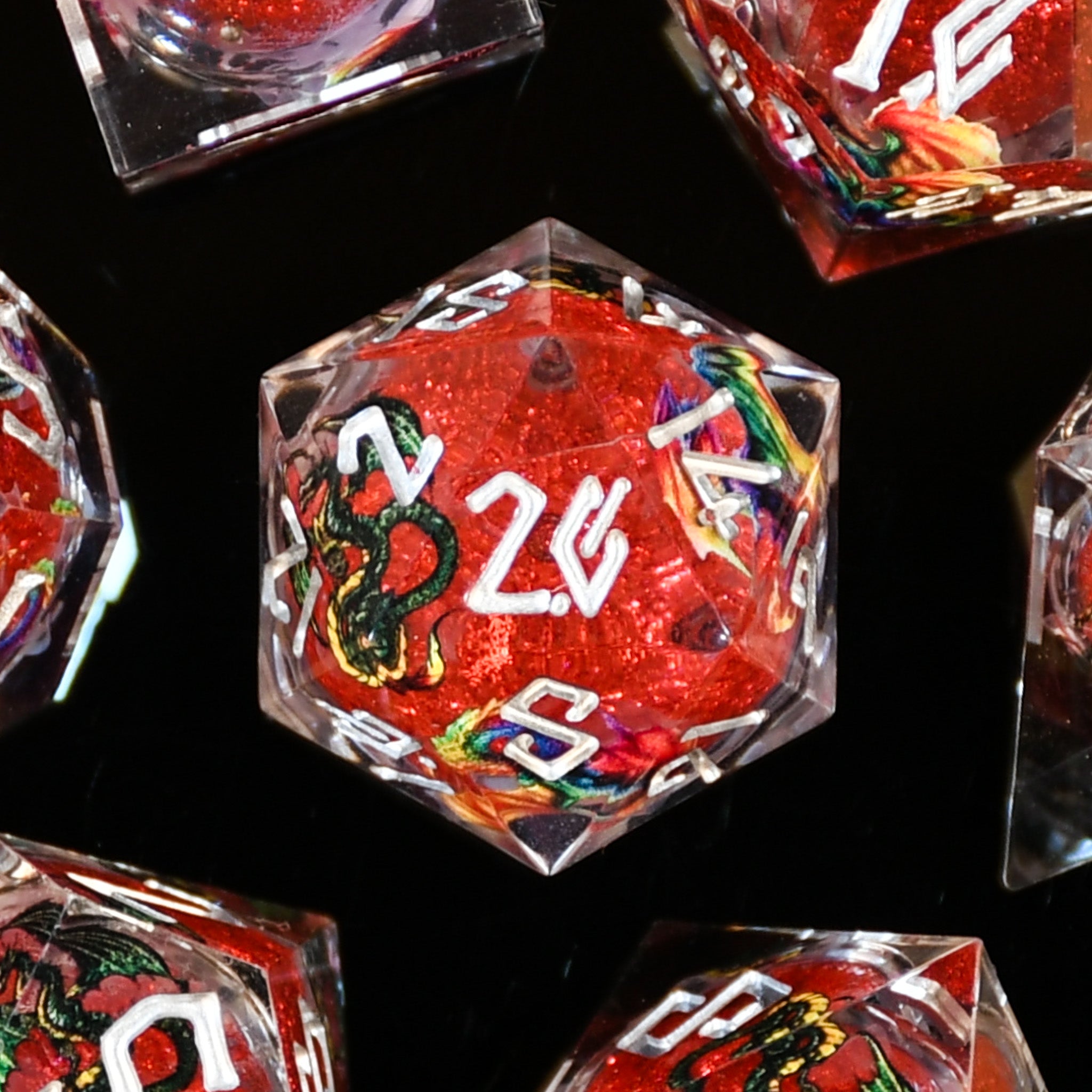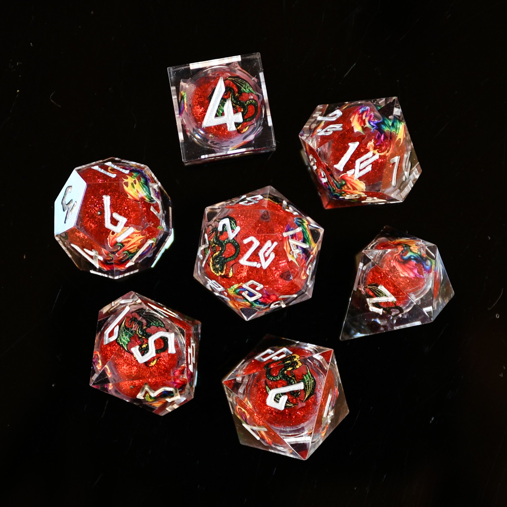 Rainbow Dragon Liquid Core Dice Set - Red and Silver