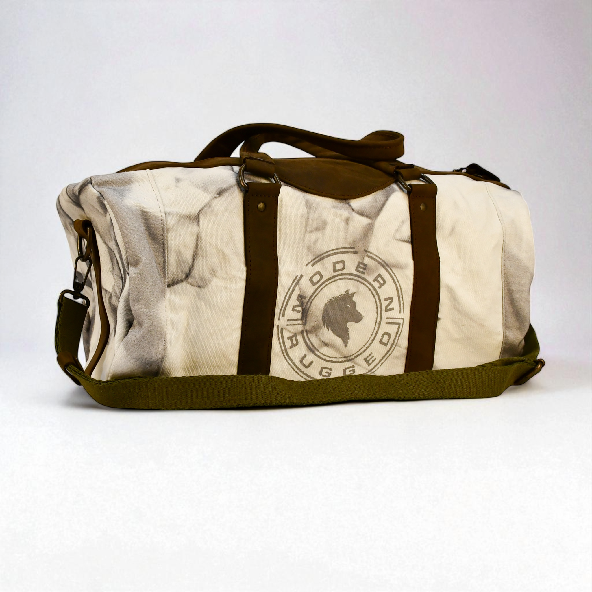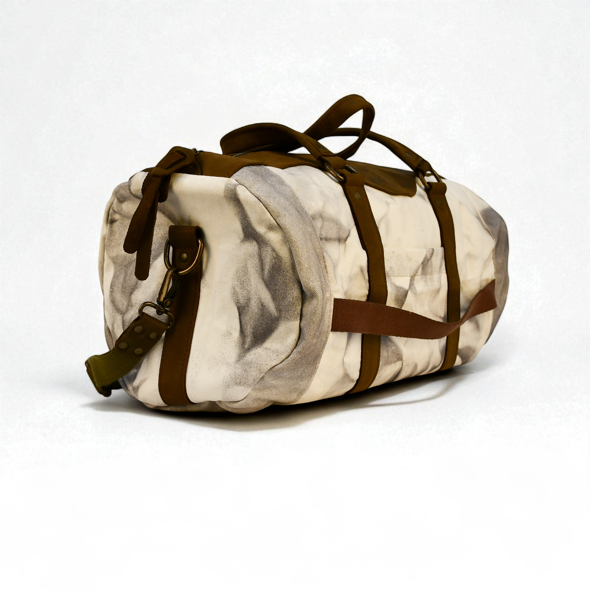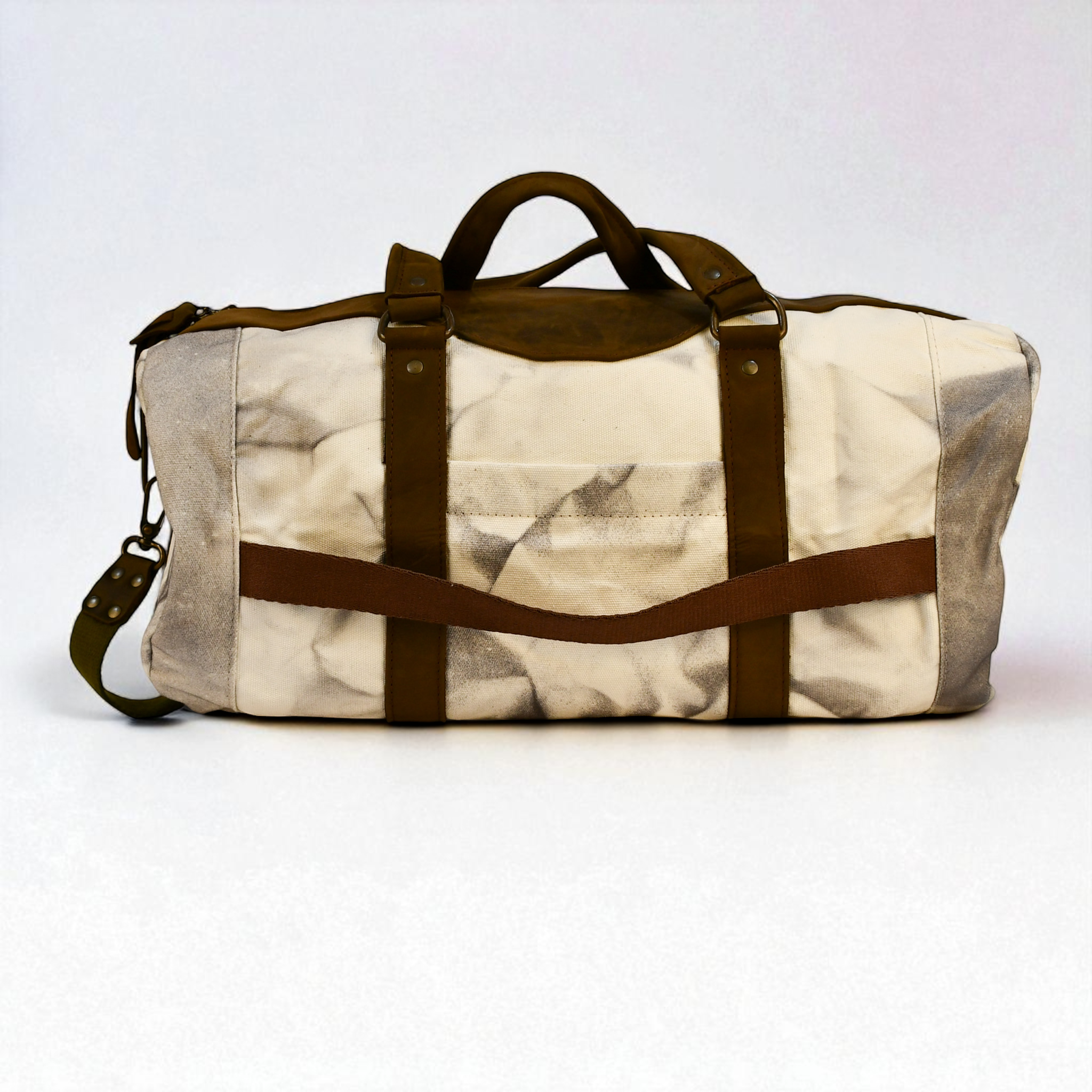 A rugged classic built for the long haul. The Modern Rugged Canvas Duffel in Marbled White pairs heavy-duty canvas with rich brown leather accents for a timeless, adventure-ready design. Whether you're traveling for the weekend, hitting the gym, or packing for the trail, this bag delivers durability, functionality, and signature Modern Rugged style.