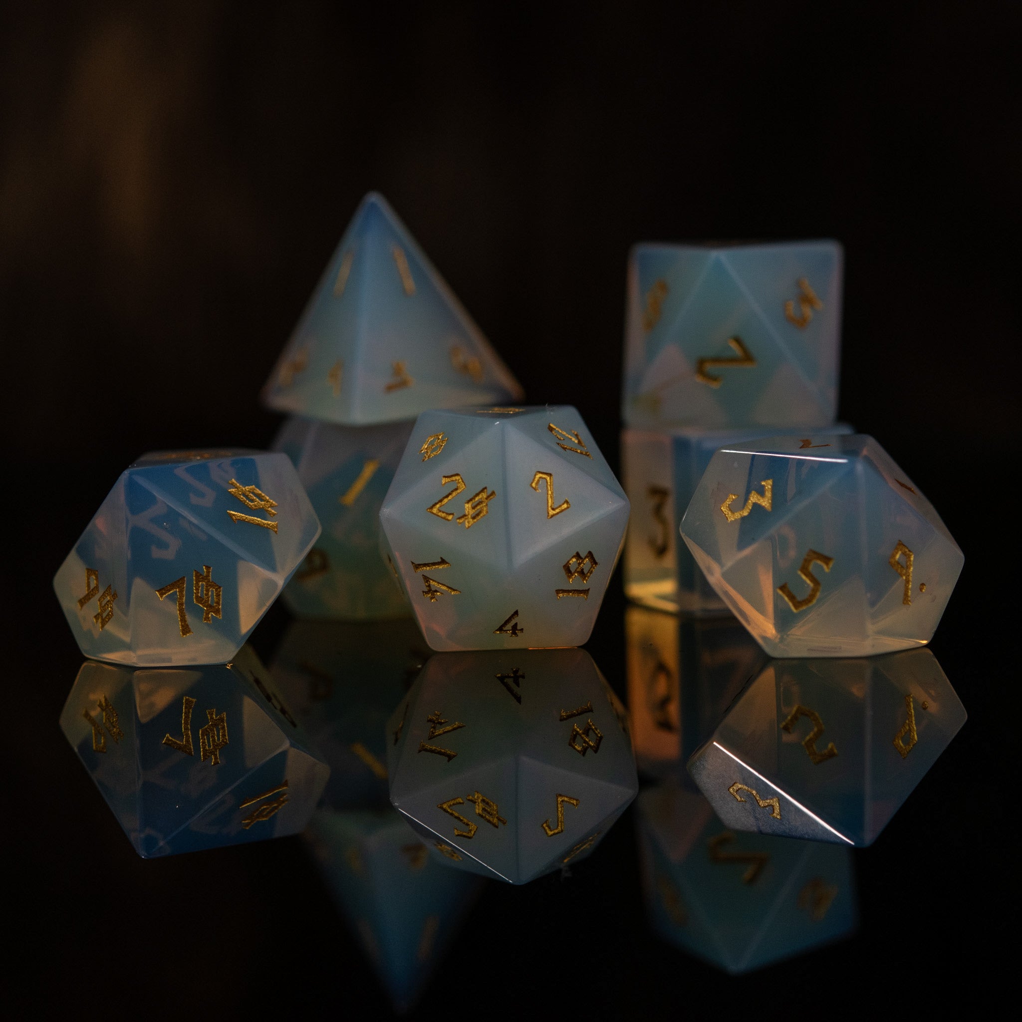 Each die is hand carved from pure gemstone and polished in a proper tumbler. Designs are then engraved into each side and hand painted. Gemstone dice are never guaranteed to have a perfectly balanced weight; however, each of our dice sets are always well weighted and well balanced.