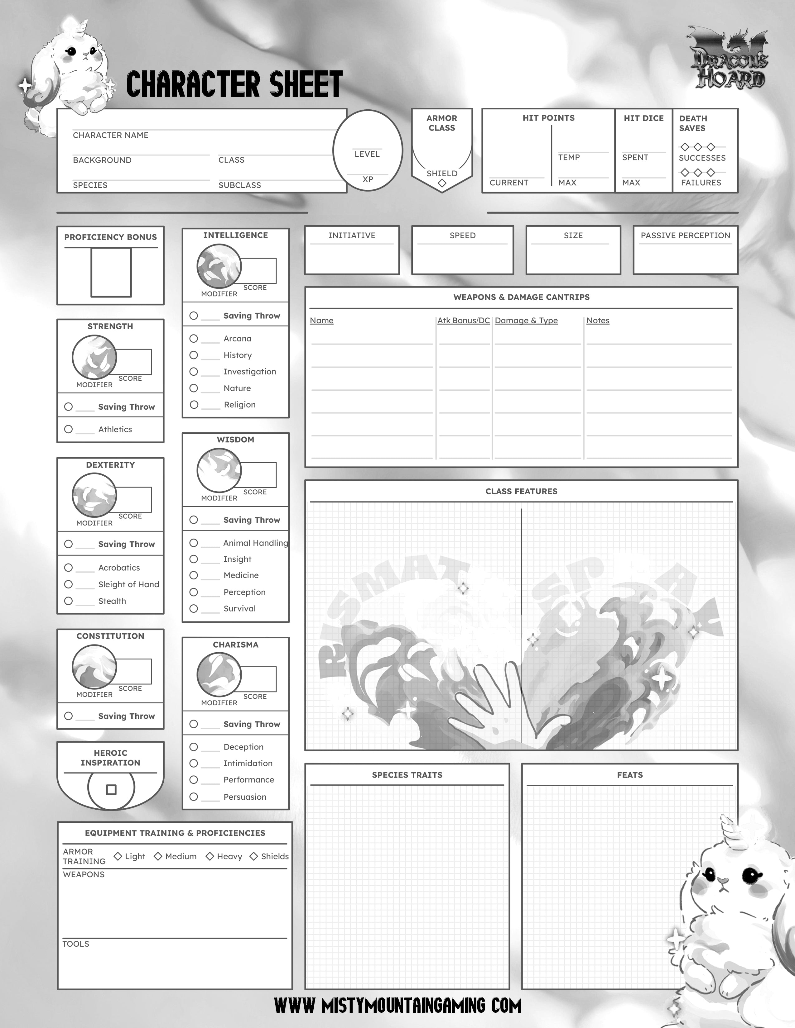 Designed for both tabletop and digital play, this character sheet blends enchanting visuals with a clean, easy-to-use layout that works beautifully whether you’re playing at the table or filling it out on your device.