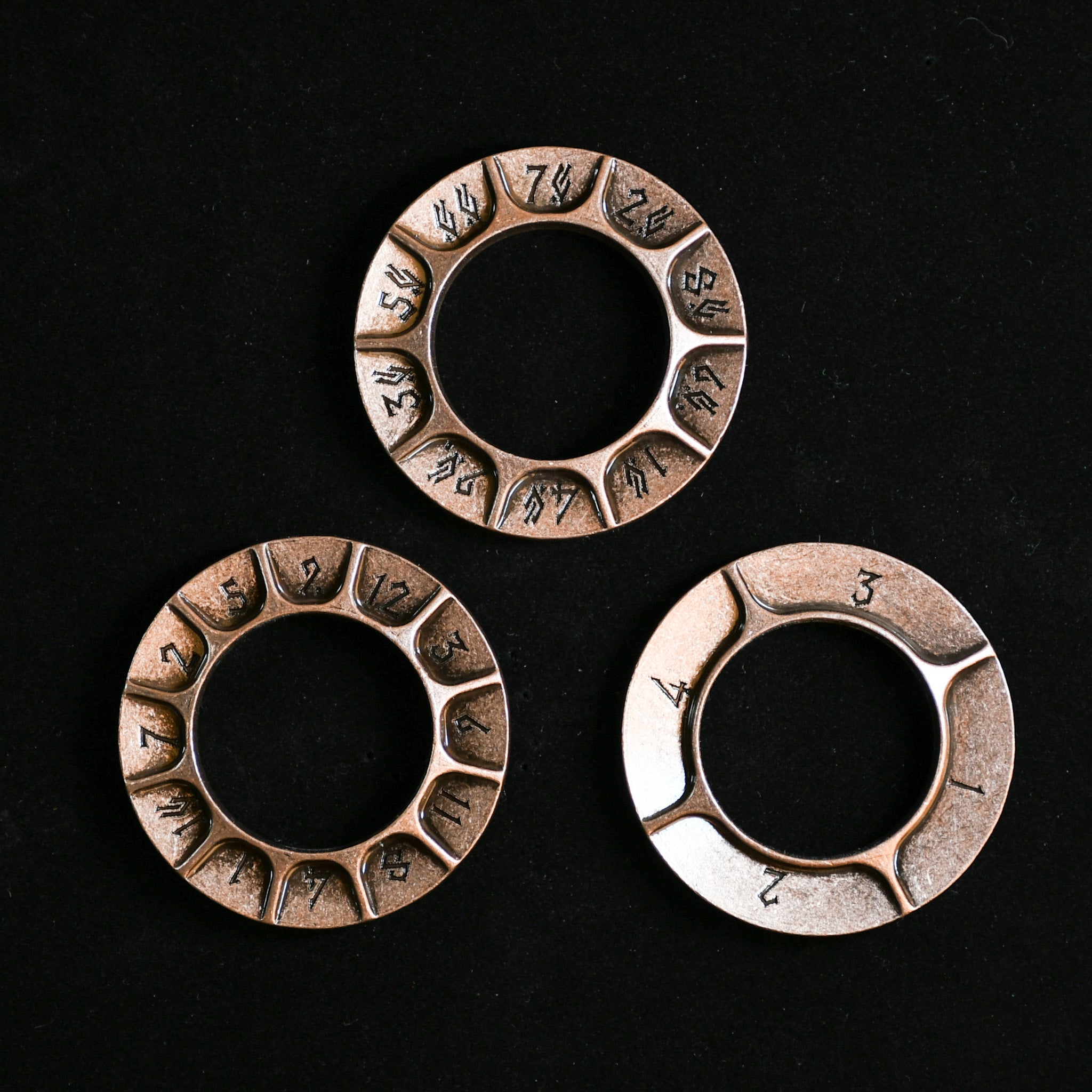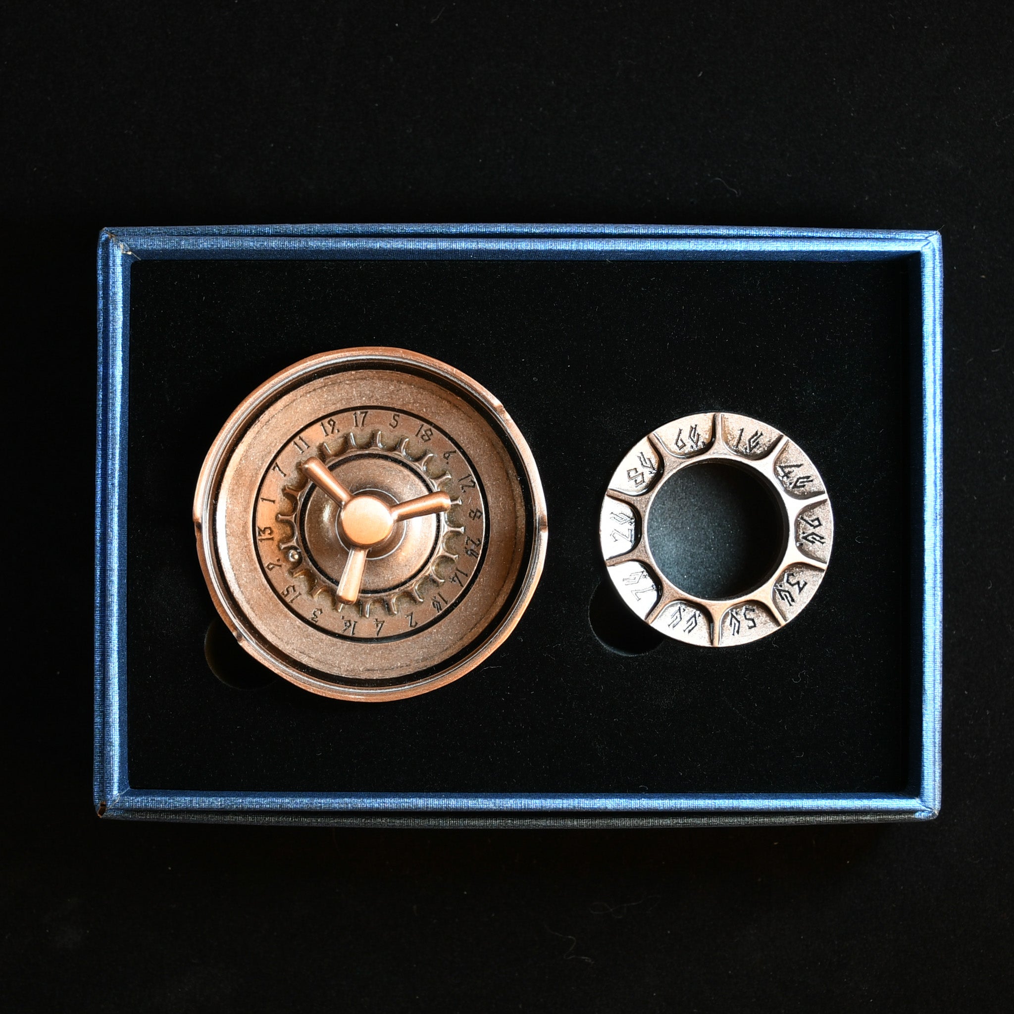 This solid metal, stylish roulette replaces all seven dice in a standard TTRPG set! The interchangeable plates are double-sided and can be used as a d20, d12, d%, d10, d8, d6, and d4, respectively.