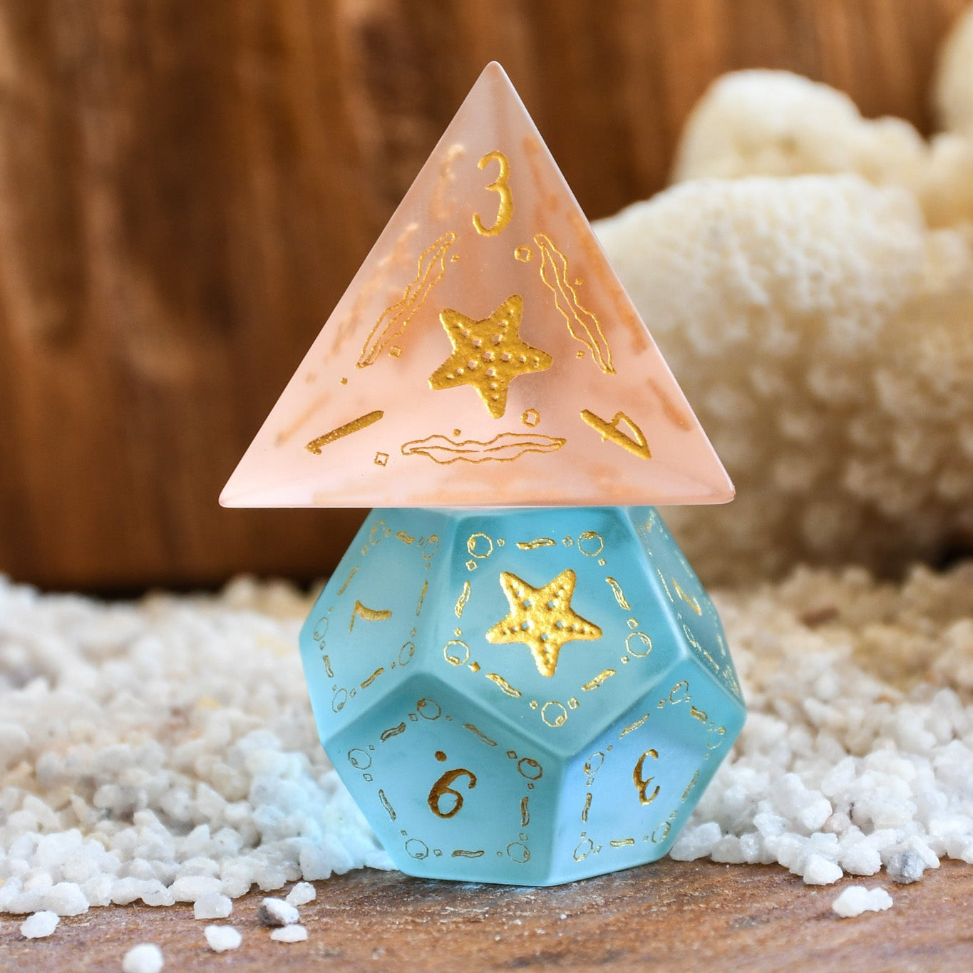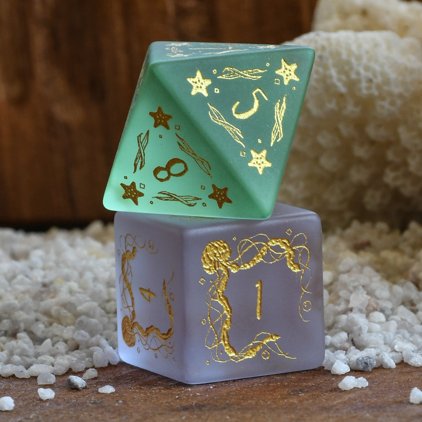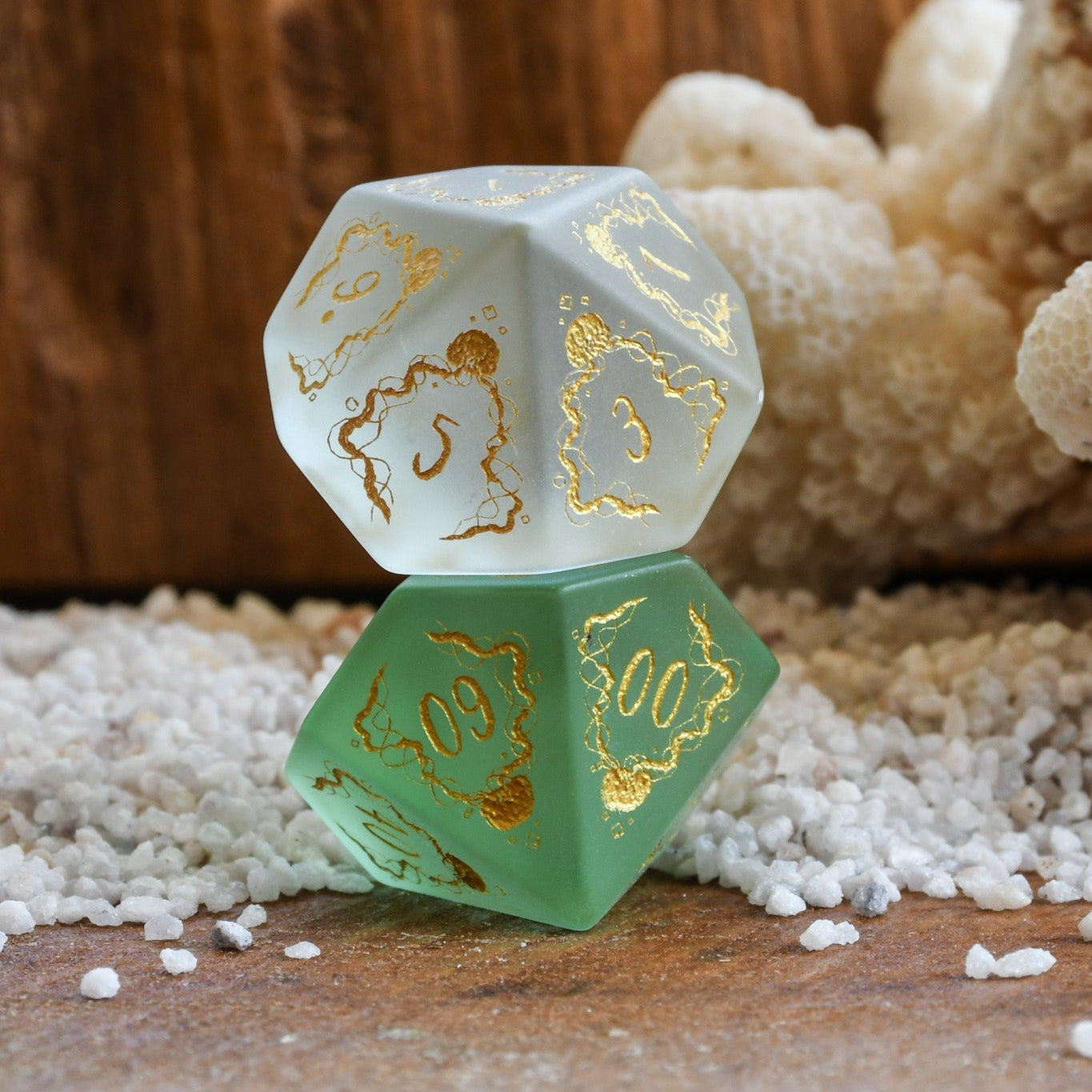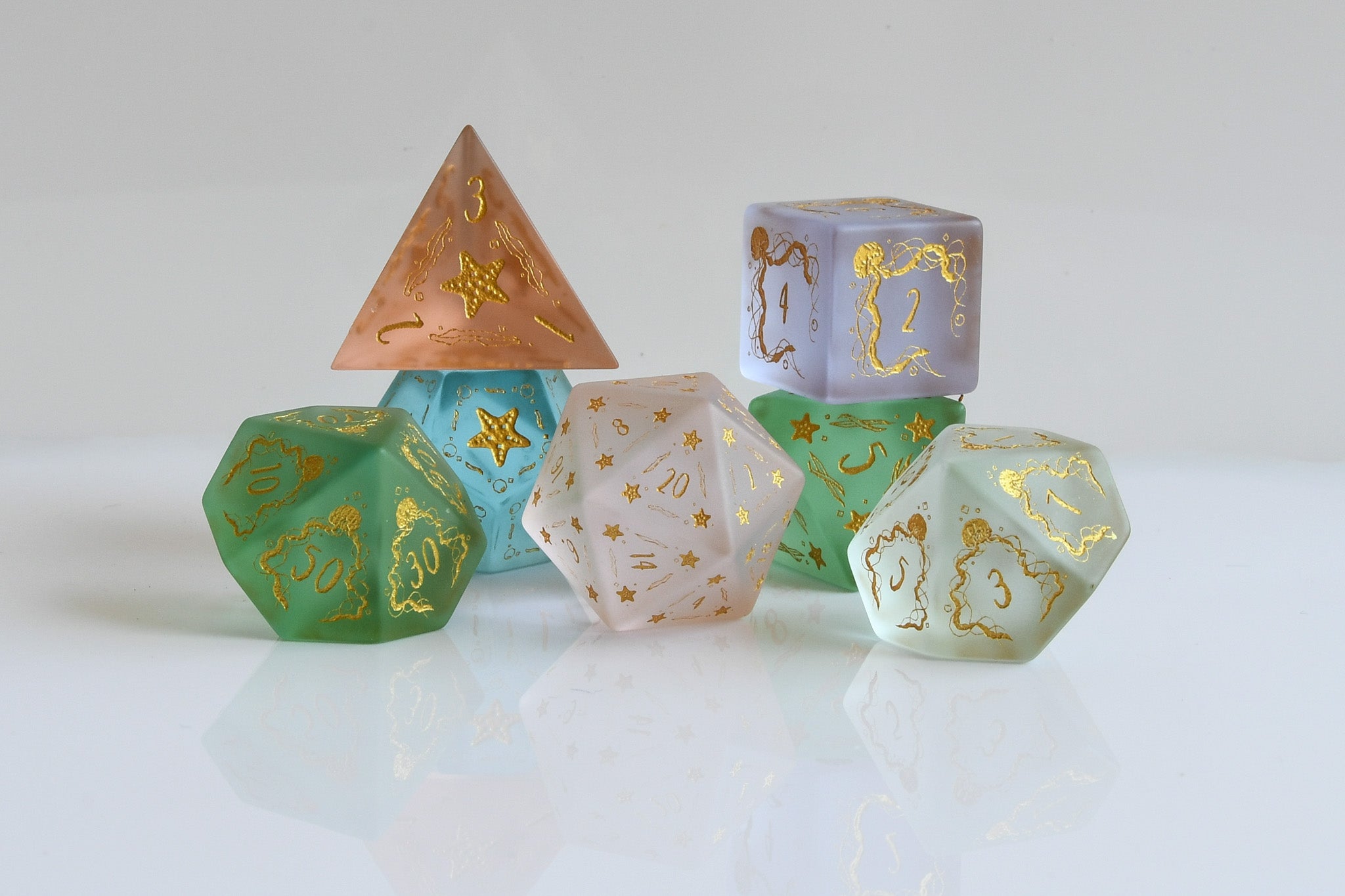 Each die is hand-carved from glass then sand-blasted. Designs are then engraved into each side and hand-painted. Each of our dice sets are always well-weighted and well-balanced.